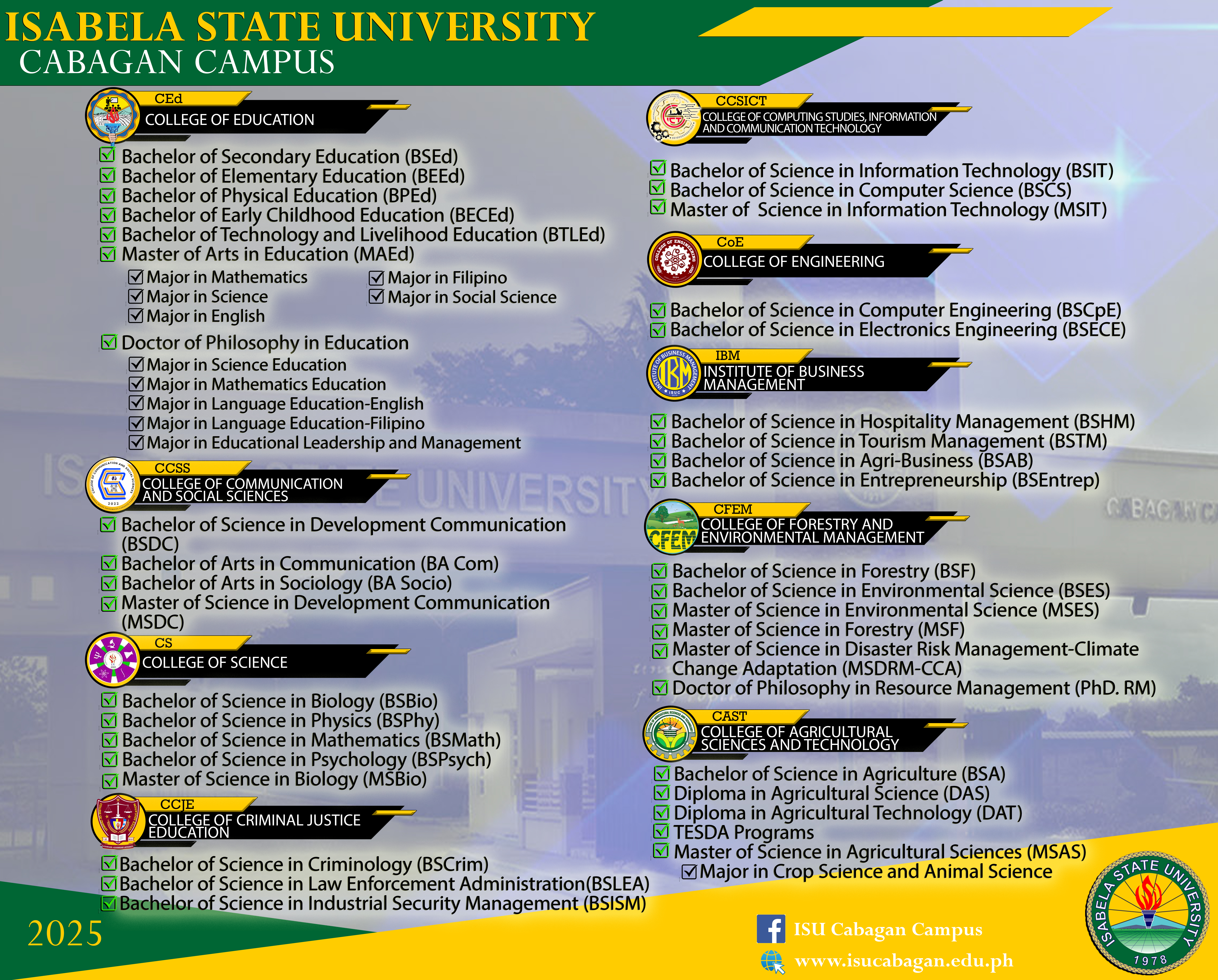 The University shall provide advance instruction in the arts, agriculture and natural sciences as well as in the technological and professional fields. This mandate is in accordance to Presidential Decree Nos. 1434 and 1437, issued on June 10, 1978 by the then President Ferdinand Marcos, establishing Isabela State University.